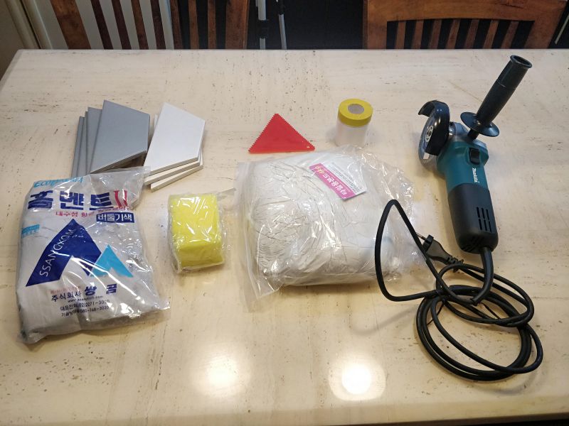 준비물은 작업하고자 하는 타일, 타일본드, 톱니 헤라(타일본드를 칠 해주는 용도), 타일 컷팅기 or 그라인더와 타일용 날, 시멘트(보통은 백시멘트를 합니다만 저는 유지보수가 쉽게 비둘기색을 골랐어요), 스펀지(시멘트를 닦을 용도)