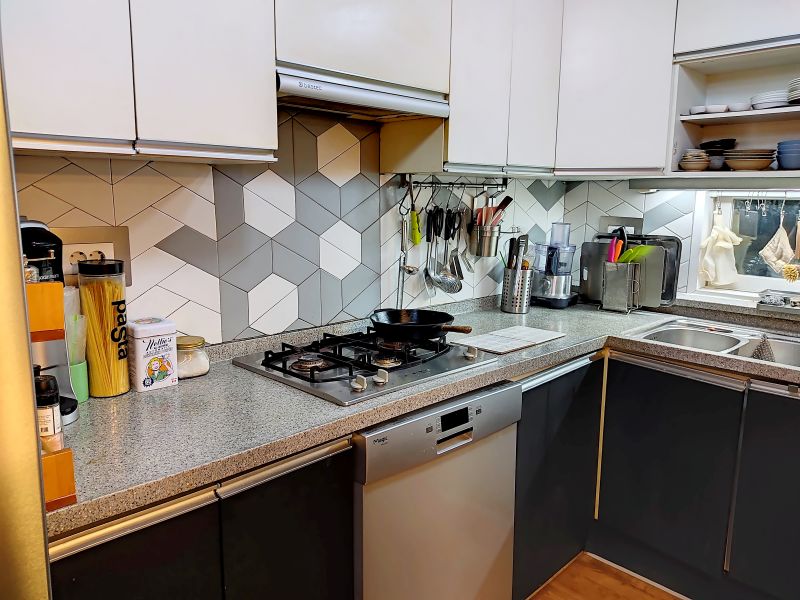 저에 경우는 가장 쉽게 더러워지는 가스레인지 앞 공간은 어두운 회색이 많이 들어가게 하기 위해 헥사곤 무늬를 만들었고 다른 곳은 화이트 색상이 많이 들어간 헤링본 무늬를 넣을 생각입니다. 하프 헥사곤 타일의 패턴이 궁금하시다면 이전 포스팅(링크)을 참고하세요.
