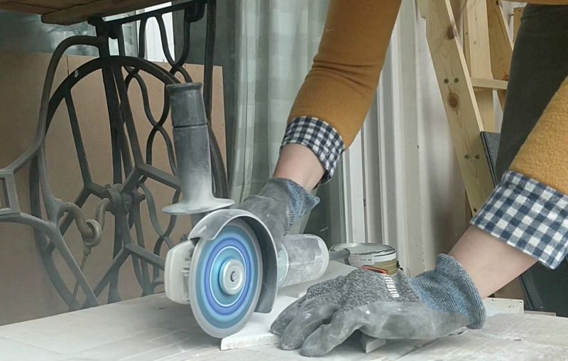 그라인더를 그라인더에 경우는 타일을 톱니바퀴로 갈아내서 하는 방식이에요. 장점은 여러 가지 모양이 가능하다는 점이고 단점은 다소 위험할 수 있다는 점과 컷팅하는 공간이 하얀 먼지로 가득 차는 것을 목격하실 수 있습니다.
