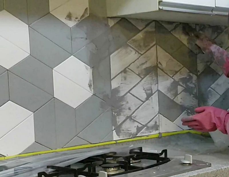 - 반죽을 하셨다면 벽면에 고무 헤라로 타일 사이사이를 잘 펴 발라주세요. 타일을 붙일 때는 작은 면적을 천천히 붙이셔도 되지만 줄눈 시공할 때는 시멘트는 반죽한 순간부터 천천히 굳어가니까 큰 면적을 빨리 작업하는 게 좋습니다.
