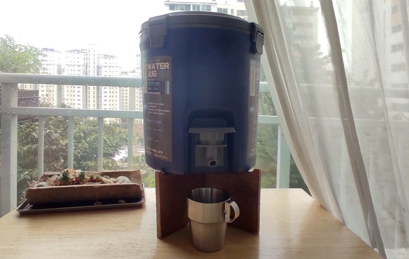 마지막으로 밸브가 아래 달려 있기에 선반이나 받침대가 필요해요. 저도 처음 사보는 거라 스탠리 받침대를 사도 호환이 되는지 알 수 없어 받침 없이 그냥 갔다가 캠핑 테이블 하나를 뺏긴 사태가 왔답니다. 저렴하고 약한 캠핑 테이블이라 무거운 워터저그를 올려놓은 것이 불안했어요.