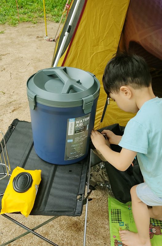 그리고 가장 큰 단점은 꿀렁 거리는 재질이 예요. 물을 쓰다 보면 압력으로 물통의 모양 일그러져 중심을 잃고 올려둔 선반에서 여러 번 추락했어요. 텐트 안에서 물을 쏟는 대형참사가 여럿 있었습니다. 그걸 막으려면 중간중간 뚜껑을 열었다 닫아 주어야 하는데 물이 나오는 밸브와 물을 담는 뚜껑이 같은 면에 있기에 무거운 물통을 돌려 뚜껑을 열어 공기를 넣어주고 다시 정수기처럼 쓰기 위해 돌려놓는 번거로운 일을 해야 해요. 하지만 수납성에서는 이만한 게 없기에 수시로 먹는 물통이 아닌, 작게 접어 가져와서 캠핑장 개수대에서 물을 떠 조리도구에 먼지를 털어내거나 아이들이 손을 씻길 때 개수대나 화장실에 가지 않고 이 물통으로 씻어 내는데 씁니다. (자연을 위해 세재는 사용하지 않습니다)